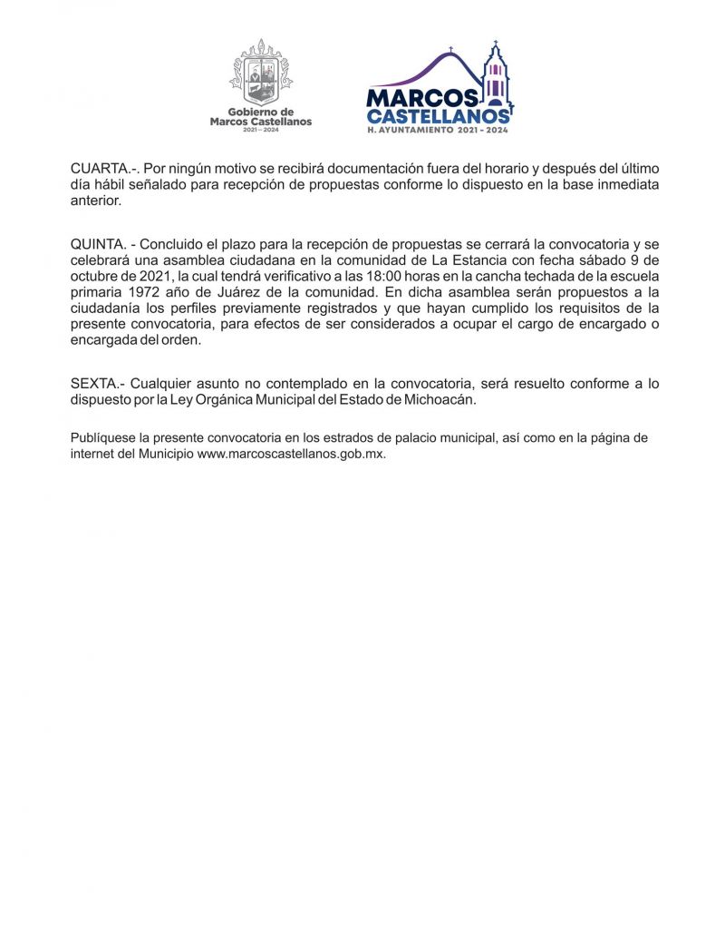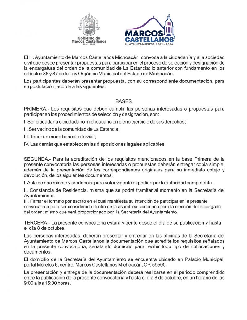 06Oct CONVOCATORIA PARA ENCARGADO DEL ORDEN DE LA COMUNIDAD DE LA ESTANCIA. Convoca al proceso de selección y designación de la encargatura del orden de la comunidad de la Estancia.